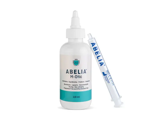 ABELIA® M-Otic er særligt velegnet til øregange med fugt, ophobning af ørevoks eller tendens til keratinisering – som set hos hunde, der bader meget, eller dyr med hudfolder omkring ørerne.