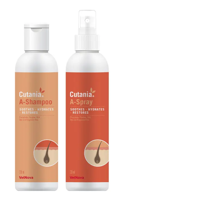 CUTANIA® A-Spray er en praktisk leave-on løsning til dyrs hudpleje. Den er nem at bruge og ideel til specifikke områder med tør eller irriteret hud.