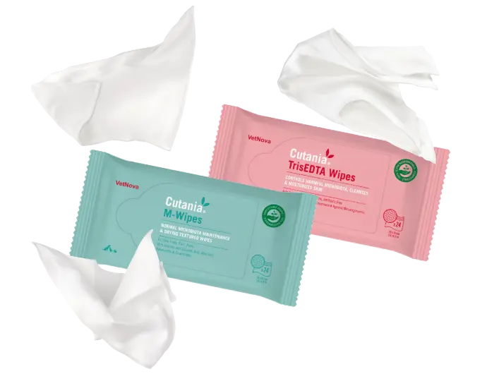 Når en komplet vask ikke er praktisk muligt, er CUTANIA® M-Wipes og CUTANIA® TrisEDTA Wipes de perfekte alternativer til hurtig og målrettet pleje af hudfolder, poter og andre udsatte områder.